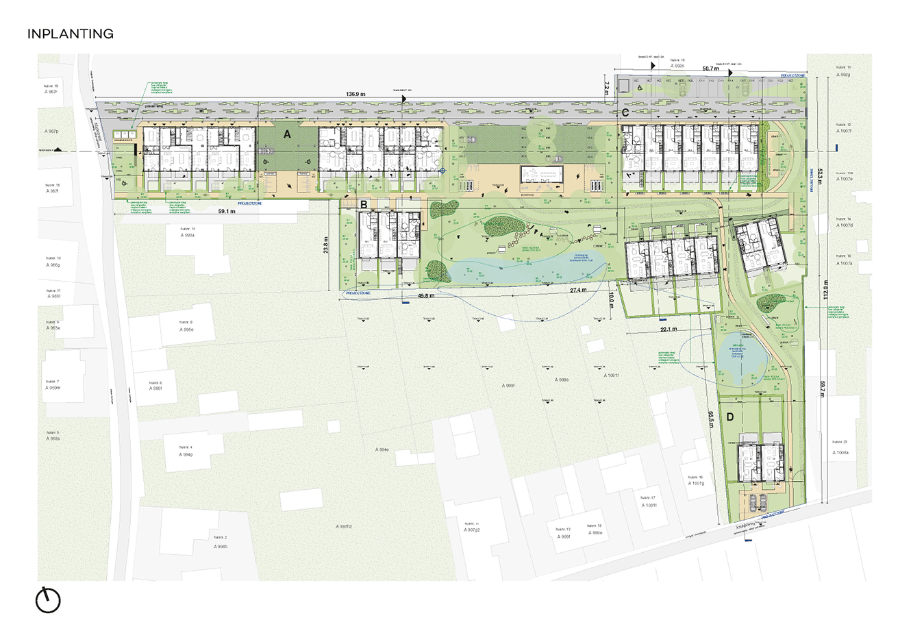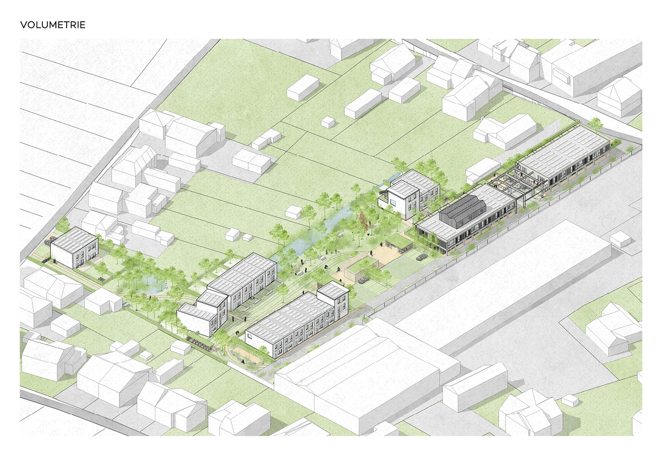 Reconversie van een voormalige ambachtelijke zone via een inbreidingsproject met woningen. Waarbij zowel renovatie als nieuwbouw wordt voorzien.